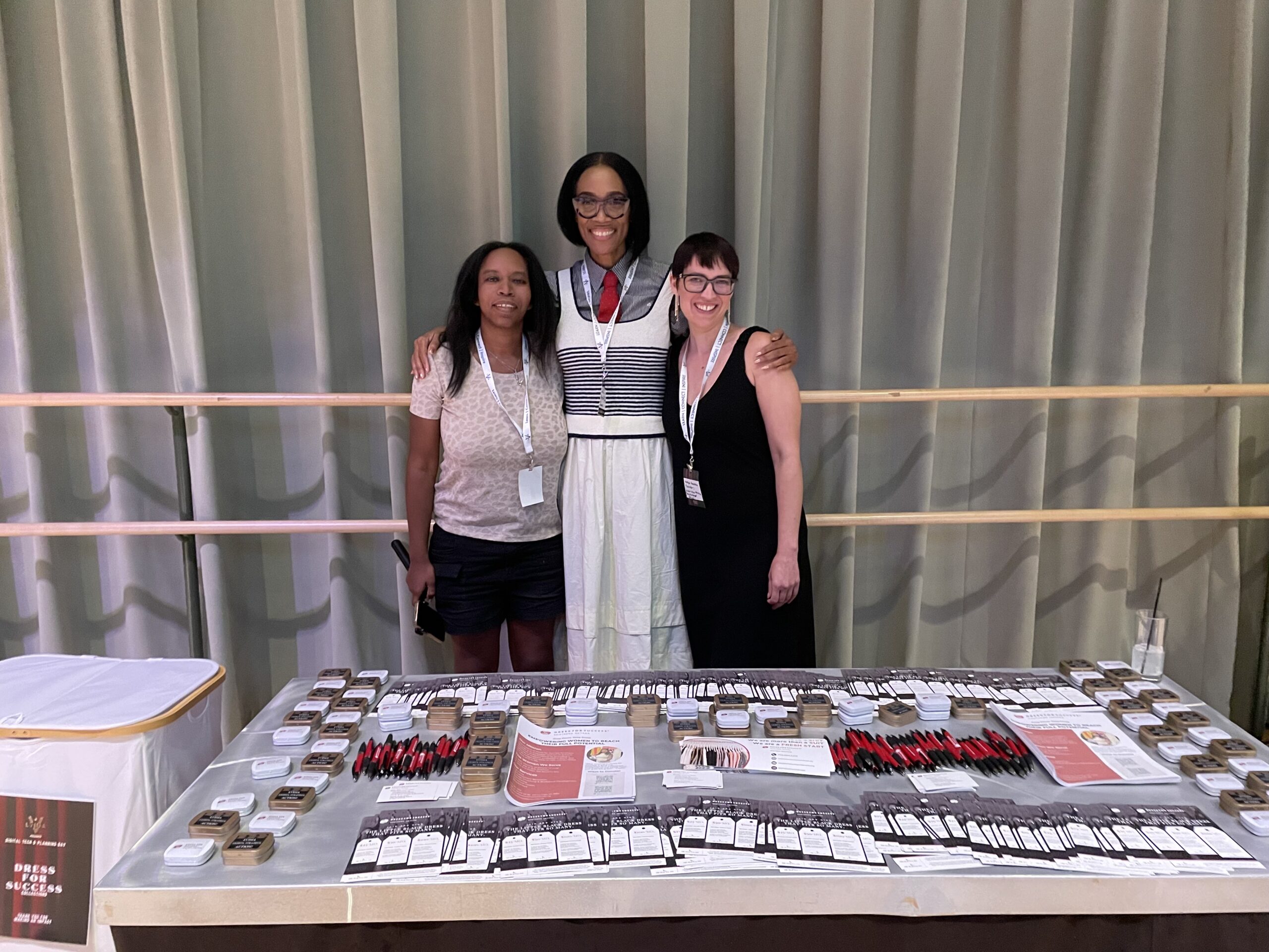 Lauren Jones, Boutique Supervisor, Lisa Wright, and Nadya Rousseau at the Dress for Success of Southern Nevada table and donation section